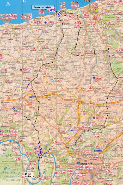 Base de loisirs Jumièges-Le Mesnil - Duclair* - Fréville - Croixmare - Motteville - Grémonville - Berville - Saint Laurent en Caux - Biville la Rivière - Brachy - Ouville la Rivière - Quiberville Plage - Hautot sur Mer - Offranville - Auppegard - Longueville sur Scie - Torcy le Grand - Bellencombre - Montville - Saint Jean du Cardonnay **- Saint Pierre de Varengeville - Duclair - Base de loisirs Jumièges-Le Mesnil.